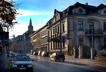 Die Bahnhofstraße in Kirchberg mit der Kirche St. Margarethen im Hintergrund.